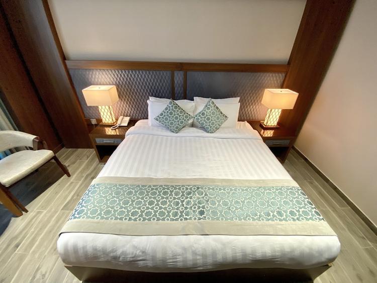 أما الغرف في الفندق فهي مجهزة بما يناسب الإقامات الطويلة أو القصيرة، حيث تحتوي على تكييف فعّال، وثلاجة صغيرة، وخزانة ملابس، وصندوق أمانات، وغلاية كهربائية، وتلفزيون بشاشة مسطحة، بالإضافة إلى حمّام خاص مزوّد بمستلزمات أساسية للنظافة.
